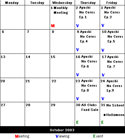 Resouces - Calendar Viewings - Ayashi No Ceres All Club Food Sale - October - July - Suggest Food Meeting Notes - October Meeting Suggestions - Suggest to Club Trips - Japan Expo - Anime Expo